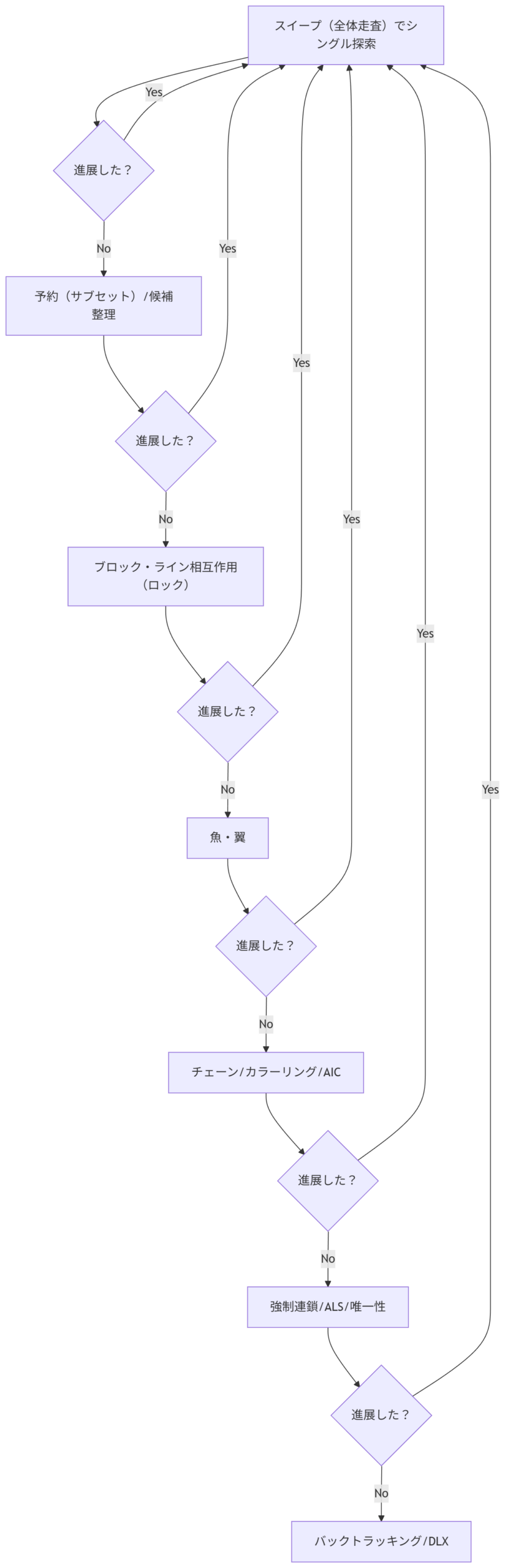 です。難問ほど「全体スキャン(スイープ)」を何度も回し、進展が止まったら上位手筋へ移るのが実務的です。